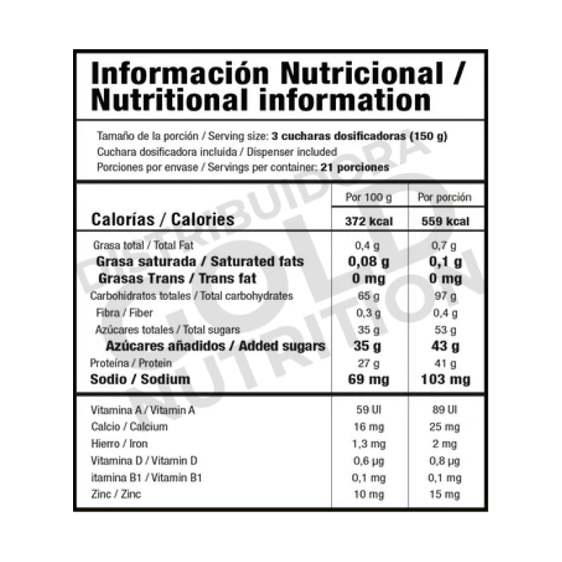 Contiene carbohidratos de rápida absorción (base de maltodextrina) para aportar energía y apoyar el aumento de peso