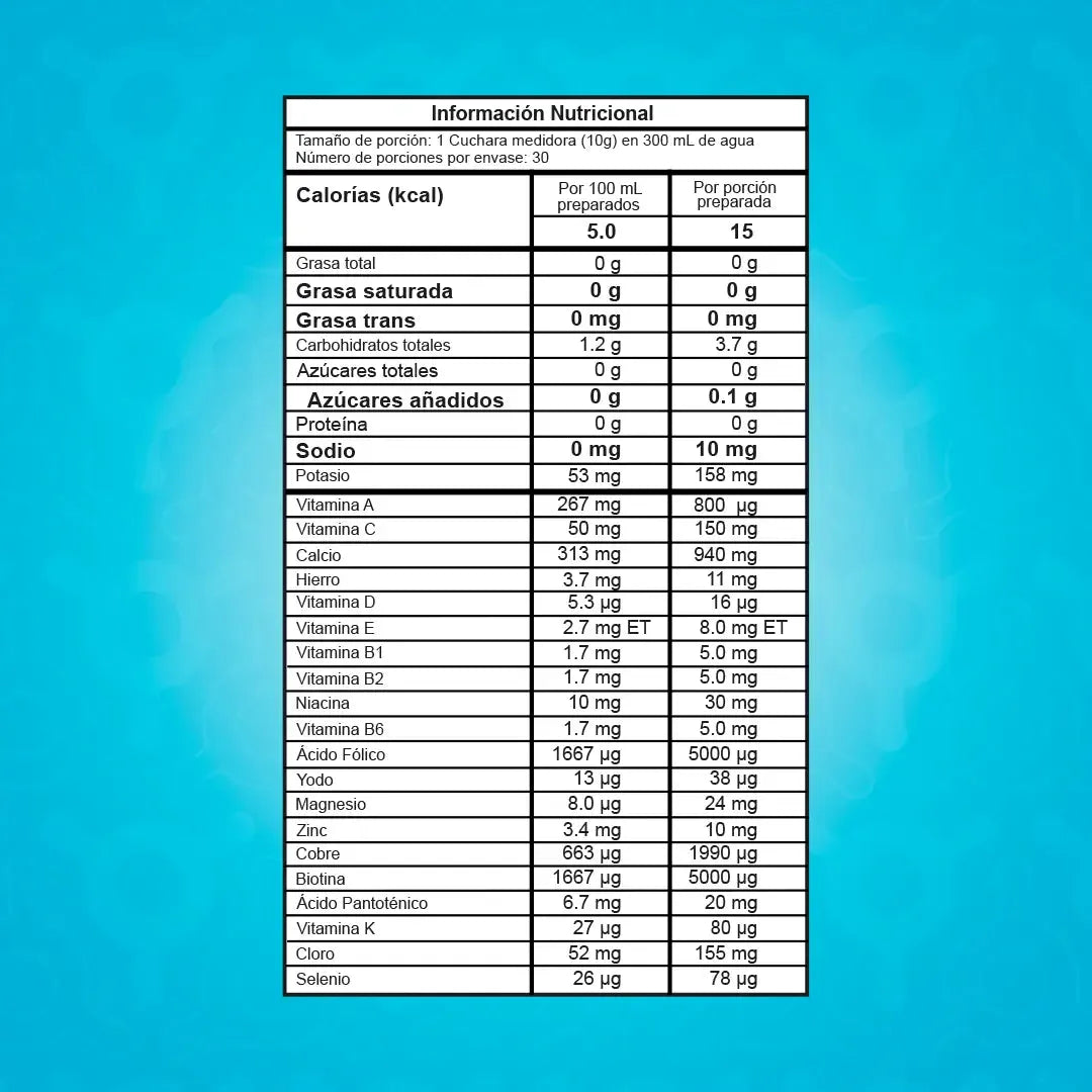 Cada porción de 10 g entrega un complejo completo de vitaminas y minerales (más de 20), acompañado de: